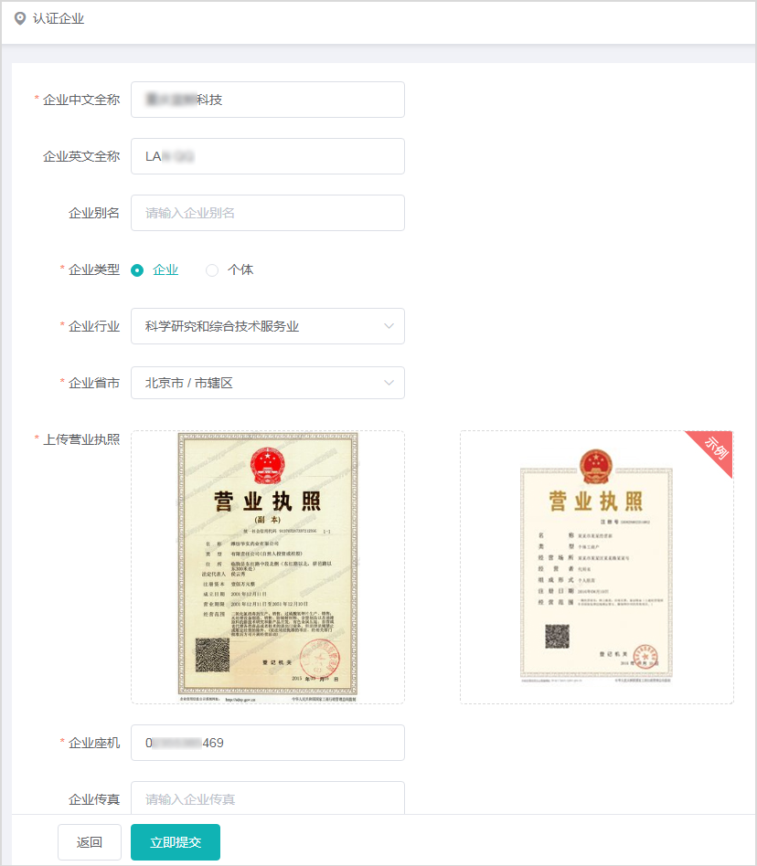 1、企业认证,认证企业时需填写企业信息,企业信息包括【企业中文名称】、【企业英文全称】、【企业别名】、【企业类型】、【企业行业】、【企业省市】、【上传营执照】、【企业座机】、【企业传真】。