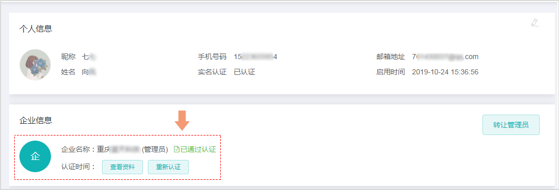 3、认证企业后的该账号,为管理员账号。