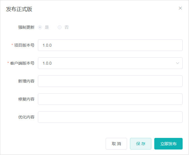 1、版本配置,对项目的版本信息进行配置,版本信息包括【项目版本号】、【客户端版本号】、【新增内容】、【修复内容】、【优化内容】。