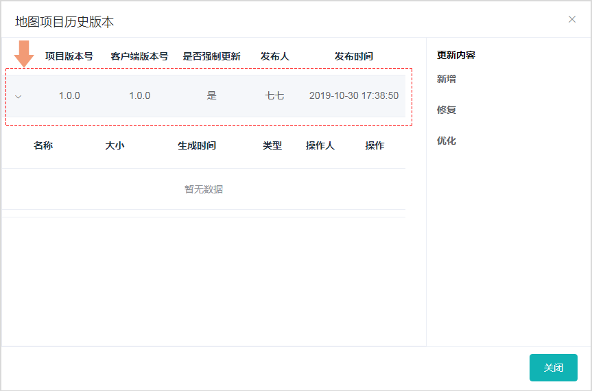 2、历史版本,单击【历史版本】,查看历史版本的相关信息,包括项目版本号、客户端版本号、是否强制更新、发布人、发布时间,更新内容等信息。